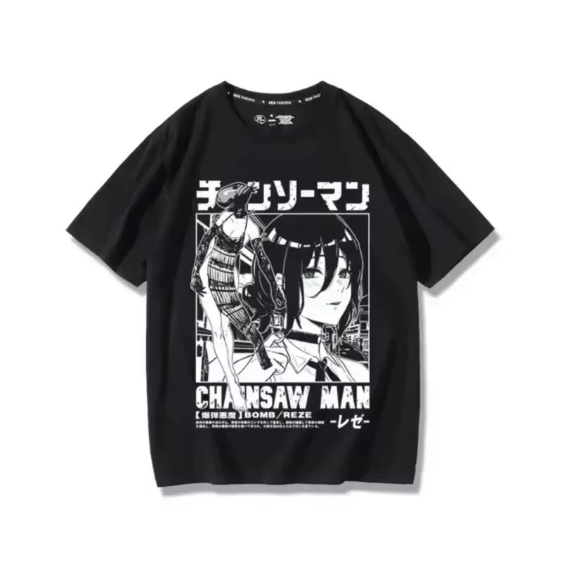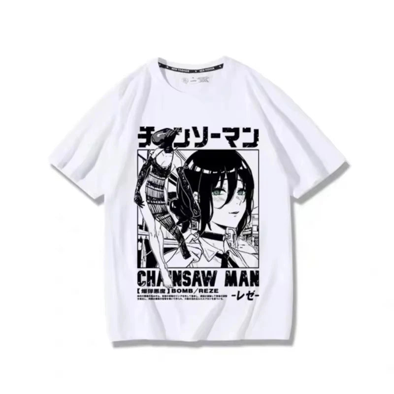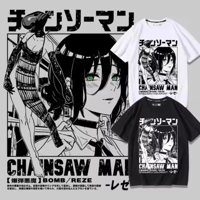 Inspired by the Bomb Girl from Chainsaw Man, this Reze t-shirt is perfect for casual wear and pairing with a black jacket for an understated, classic anime look.