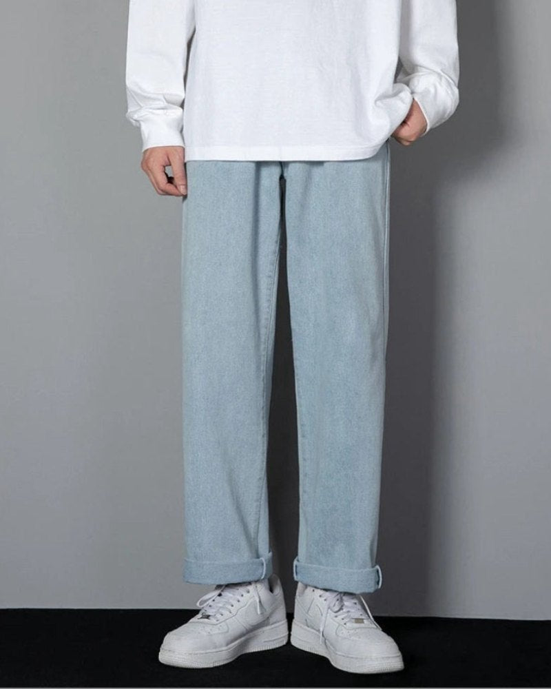 Inspired by the college scene of downtown Tokyo, these medium cut jeans are casual and chic, featuring mid-cut leg, hem and pale blue finish, great for everyday wear.